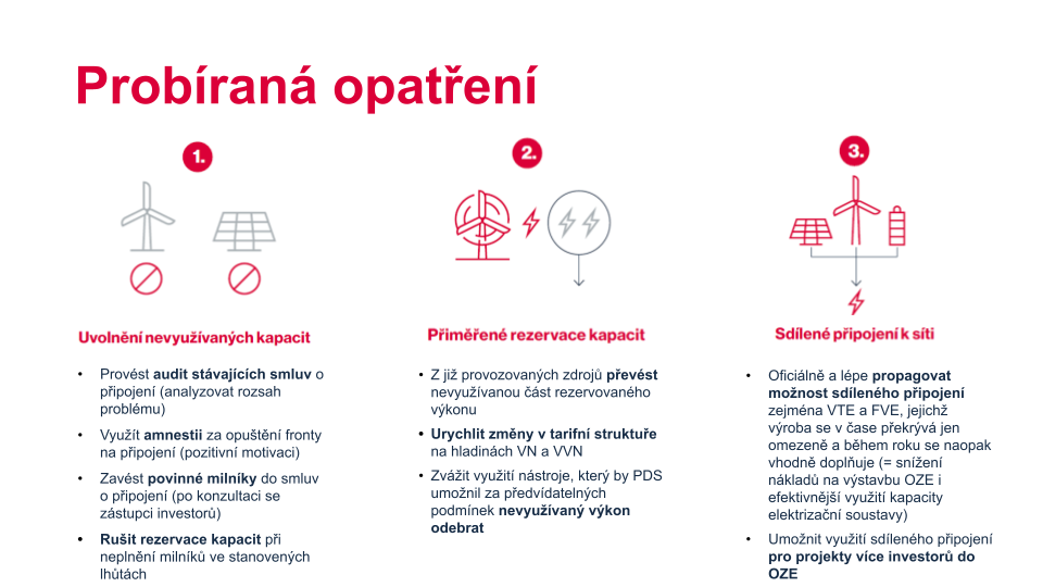 - Motivovat developery k opuštění fronty na připojení. Nejprve prostřednictvím pozitivní motivace (amnestie) a posléze zavedením povinných milníků do smluv o připojení.
