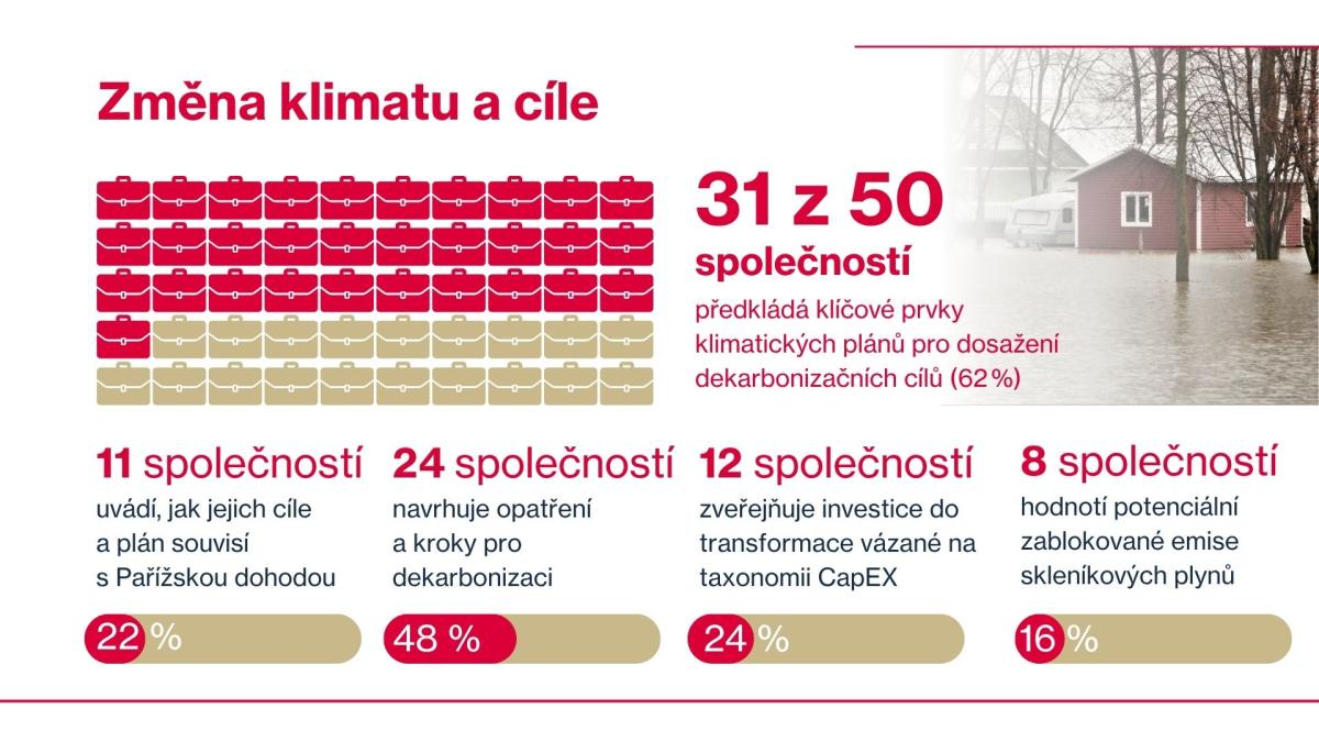 - Zveřejňování výhledových informací, jako jsou plánované investice a překážky při zavádění opatření, je na vzestupu, ale stále není jednotné. Tyto informace jsou přitom zásadní pro věrohodné a na budoucnost připravené klimatické strategie.