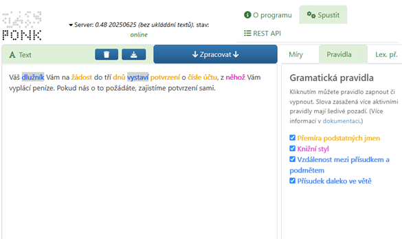 Doplnila, že PONK v zadaném textu zvýrazní sporná vyjádření nebo větné vazby. Je pak na autorovi, aby text upravil do srozumitelnější podoby, aniž by utrpěla přesnost a obsah. Takto si může už nyní kdokoli své texty online zkontrolovat.